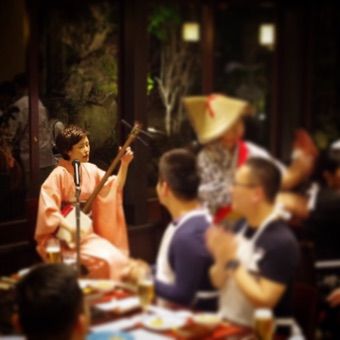 ライブ舞台があり、民謡(唄や三味線)をお客様とマイクシェアしてお食事ができるお店